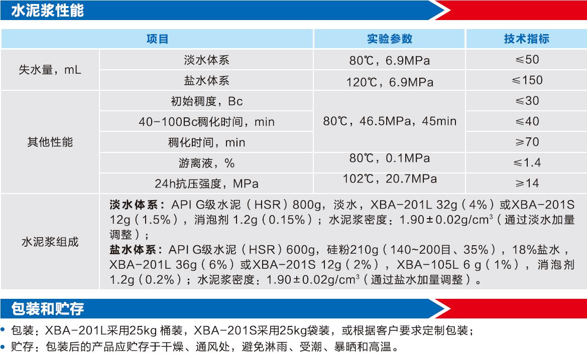 • XBA- 201实际加量需根据温度、盐浓度、固井要求调整。