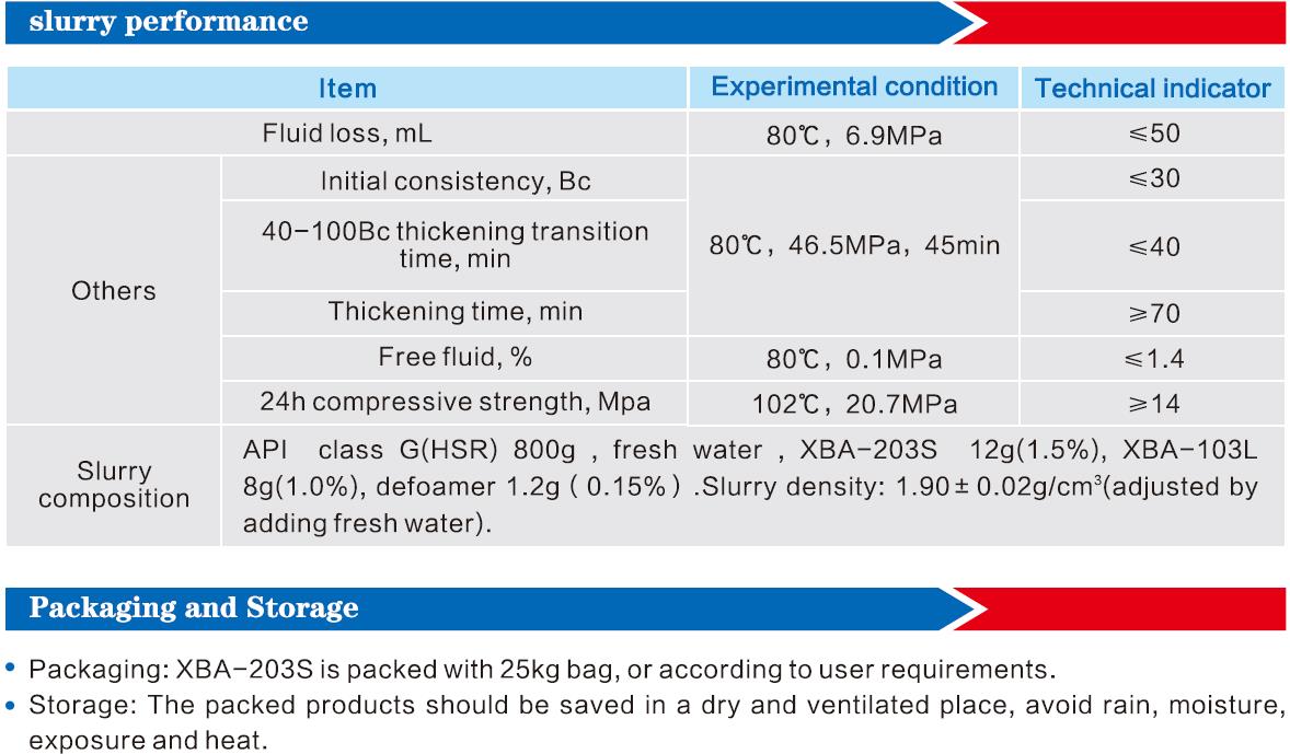 • XBA-203S has a certain effect in viscosity and some dispersant may be added in cement slurry.